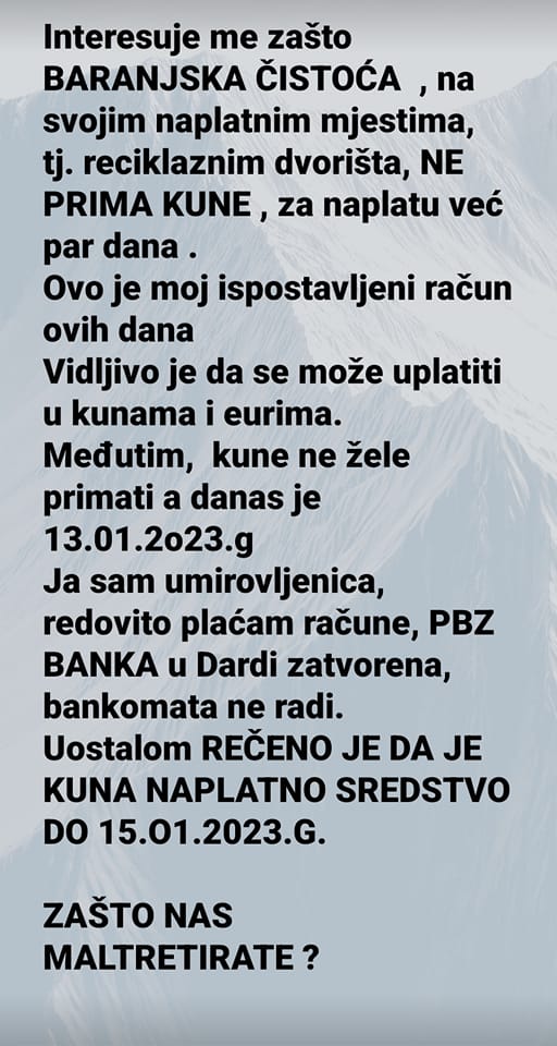 Tijekom razdoblja od 14 dana kada je na snazi plaćanje i kunama i eurima (tako je Vlada RH odredila), pametnjakovići iz Baranjske čistoće pred istek tog roka ne primaju kune. Lokalni šerifi misle da su iznad svih i da de mogu ponašati kako žele. E...ne može tako!